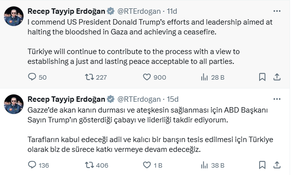 • “Gazze’de akan kanın durması ve ateşkesin sağlanması için ABD Başkanı Sayın Trump’ın gösterdiği çabayı ve liderliği takdir ediyorum.